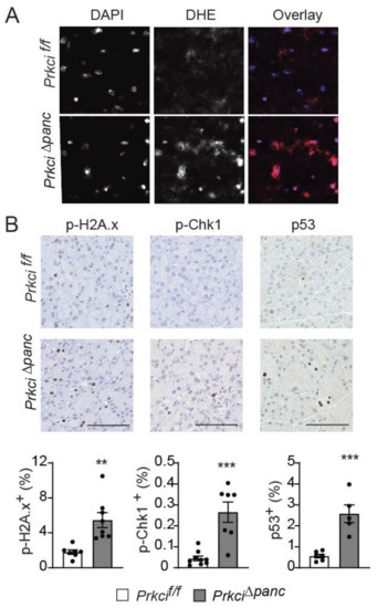 Loss of pancreatic PKCι expression induces oxidative stress and DNA damage. (A) Representative images of superoxide detected by DHE staining and overlaid with DAPI staining in pancreata of 1.5 month old Prkcif/f and Prkci∆panc mice. (B) IHC detection of p-H2A.x, p-Chk1, and nuclear p53 in 1.5 month old Prkcif/f and Prkci∆panc mice pancreata. Bars = 100 µm. Quantitative analysis of IHC staining is presented in the graphs below images. Mean SE is plotted; n ≥ 6. ** p < 0.01, *** p < 0.001.