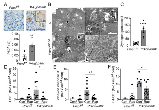 To confirm that the higher level of P62 aggregates detected in Prkci∆panc pancreas was due to blocked autophagy, we used the mTORC1 inhibitor, rapamycin, to de-repress mTORC1-mediated inhibition of autophagy [45]. As expected, activation of autophagy by mTORC1 inhibition resulted in significantly less accumulated P62 aggregates in Prkci∆panc acinar cells, without a significant effect on the already low levels of P62 aggregates in Prkcif/f acinar cells (Figure 5D), supporting the conclusion that loss of Prkci expression blocks acinar cell autophagy. Additionally, rapamycin treatment of Prkci∆panc mice resulted in a significantly lower level of acinar cell apoptosis and pancreatic macrophage infiltration (Figure 5E,F), consistent with the well-characterized role of autophagy in protecting against inflammation and tissue damage (reviewed in [46]).