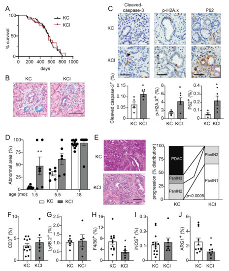 Pancreas-specific Prkci knockout increases early KrasG12D-mediated PanIN formation, but blocks progression to adenocarcinoma and alters immune cell infiltration. (A) Kaplan-Meier analysis of overall survival of KC and KCI mice (n = 51, 50, respectively). (B) Representative images of Alcian blue-stained pancreas from 1.5 month old KC and KCI mice (scale bar = 100 µm). (C) Representative images (top) and quantitative analysis of IHC detection (bottom) of cleaved caspase-3, p-H2A.x, and P62 aggregates in PanIN lesions of 1.5 month old KC and KCI mice, (scale bar = 50 µm). Results plotted as mean ± SE; n = 4–5; * p < 0.05. (D) Quantitation of area of abnormal tissue (ADM, dysplasia, and PDAC) in KC and KCI mouse pancreas is plotted; n ≥ 6, ** p < 0.01 compared to KC. (E) Representative images of H&E stained pancreas from 18 month old KC and KCI mice are shown (left; scale bar = 200 µM). Neoplastic progression of 18 month old KC and KCI mice is plotted; (right; n = 13, 9; see also Figure S7D). Quantitative analysis of IHC detection of (F) T cells (CD3+), (G) neutrophils (Ly6.B+), (H) macrophages (F4/80+), (I) M1 polarized macrophages (iNOS+), and (J) M2 polarized macrophages (ARG1+) in pancreatic lesions of 18 month old KC and KCI mice. IHC quantitation is plotted as mean SE; n = 6–15. * p < 0.05.