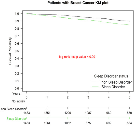 After application of the inclusion and exclusion criteria and use of PSM, we identified 2966 patients with breast IDC who had undergone breast surgery and an SLNB or ALND for AJCC clinical stage I–III IDC. These patients were eligible for further analysis and, in order to compare all-cause mortality, were divided into two groups based on their sleep disorder status. Patients with a sleep disorder diagnosed before breast surgery were placed into Group 1, and those without a diagnosis of a pre-existing sleep disorder were placed into Group 2.