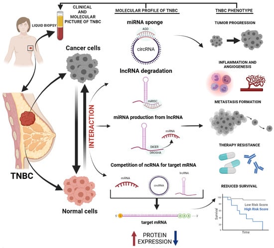 Interaction between the tumor and the host resulting in alteration of ncRNAs machinery for the development of the unique phenotype of TNBC and the usefulness of liquid biopsy for the tumor management—altered expression pattern of ncRNAs drivesan unfavorable phenotype of cancer, therefore profiling of ncRNAs in blood sample reflects molecular and clinical picture of TNBC.