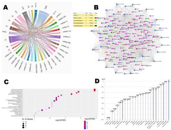 Bioinformatics analysis of the blood circulating miRNAs and lncRNAs serving as diagnostic biomarkers of TNBC: (A)—chord diagram demonstrating the relationship between circulating miRNAs found in TNBC and their relationship to different cancers; (B)—regulatory network of the studied miRNAs, followed by KEGG enrichment analysis (genes crucial for the unique pathways were marked by appropriate colors); (C)—KEGG enrichment analysis for the circulating lncRNAs; (D)—diagnostic accuracy of the discussed ncRNAs for the non-invasive detection of TNBC; (BC—breast cancer, CRC—colorectal cancer, EC—esophageal cancer, GC—gastric cancer, HCC—hepatocellular cancer, LC—lung cancer, OC—ovarian cancer, PANC—pancreatic cancer, PC—prostate cancer, RC—renal cancer, TC—thyroid cancer).