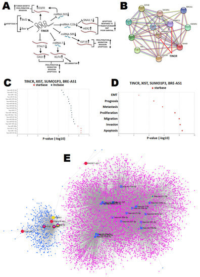 TINCR regulatory network predisposing development of unique TNBC phenotype (A), and bioinformatics analysis of studied ncRNAs: (B)—protein–protein interaction network regulated by examined lncRNAs, (C)—miRNA targets for the lncRNAs, (D)—role of the lncRNAs for establishment of aggressive phenotype of TNBC, (E)—ncRNAs’ interaction network among all discussed miRNAs, lncRNAs, and circRNAs.