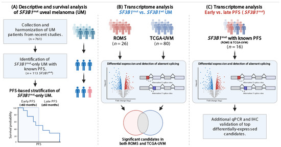 Flowchart visualizing study design and aims. (A) Data from SF3B1mut UM from 11 cohorts were collected and described with stratification criteria. (B) Differential gene expression analysis (DGE) was performed and the ROMS, and TCGA-UVM data were intersected to investigate SF3B1mut specific transcripts. (C) DGE was performed on SF3B1mut-only samples using the PFS stratification criteria to investigate transcript expression characteristic for early onset (PFS < 60) and late onset (PFS ≥ 60 months). Finally, in silico results were validated in vitro.