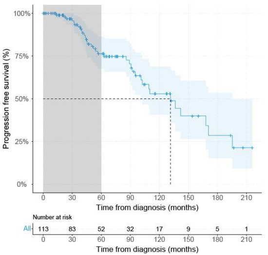From the 146 acquired UM, survival data were available for 113 patients, 19 patients had PFS < 60 months (with metastatic disease), and 52 UM patients had PFS ≥ 60 months. Only the mean largest tumor diameter was significantly (p < 0.001) larger (17.7 mm (±2.8 SD) in the PFS < 60 group compared to the PFS ≥ 60 months group (mean: 14.7 mm (±3.7 SD) (Table 1). The median PFS of all SF3B1mut UM at risk (n = 113) was 131.5 months (95% CI: 101.0–195.4) using Kaplan–Meier survival analysis (Figure 2).