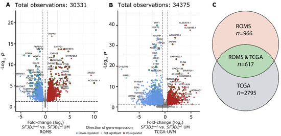 Differential gene expression in SF3B1mut UM. (A) Volcano plot of the differential expression analysis between SF3B1mut (n = 12) and SF3B1wt (n = 14) UM within the ROMS cohort. Genes significantly down-regulated (blue) and up-regulated (red) in SF3B1mut UM are shown. Gene names for the top 50 genes (based on descending -log10 q-value) and top 20 (based on |log2 fold change|) for both directions are shown. Genes that were found to be differentially expressed in both cohorts (a and b; n = 617) are highlighted by a dark green outer circle. The x-axis displays the log2 fold-change and y-axis displays the adjusted p-value (q) on a -log10 scale. The total amount of tested genes is shown on top. (B) Same as a), except for the differential expression analysis between SF3B1mut (n = 15) and SF3B1wt (n = 61) UM within the TCGA-UVM cohort. (C) Venn diagram displays differential gene expression results for ROMS, ROMS and TCGA, and TCGA cohorts.