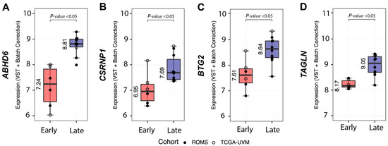 Differential gene expression between SF3B1mut with short PFS < 60 (Early-onset) vs. SF3B1mut with a long PFS ≥ 60 months (Late-onset). Overview of the most differentially expressed genes between SF3B1mut with an PFS < 60 from the combined (ROMS and TCGA-UVM) cohort. ROMS samples are depicted with closed circles, and TCGA-UVM are depicted with open circles. The boxplots show the variance stabilizing transformation (VST-transformed and batch corrected) expression per PFS category and metastatic status for (A) ABHD6, for (B) CSRNP1, for (C) BT2G, and for (D) TAGLN. All results show p-adjusted value < 0.05.