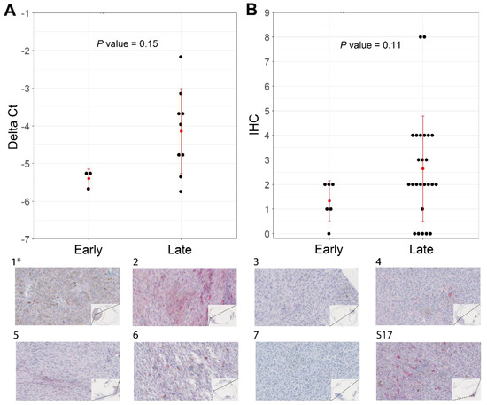 Increased levels of ABHD6 can be associated with SF3B1mut UM with late-onset metastatic disease (PFS ≥ 60 months). (A) RT-qPCR performed in triplicates using CHMP2A expression as a normalizer of 10 primary UM (see Supplementary Figure S5). (B) ABHD6 IHC on all SF3B1mut UM samples that were available and stratified for early- and late-onset metastatic disease. Red error bars represent standard deviation and red dot represents mean. Wilcoxon rank sum test was used to evaluate statistical difference of delta Ct values and IHC scores shown in scatterplots in panel A and B. p-value < 0.05 was considered statistically significant. (1*–7 and S17) ABHD6 IHC staining of eight primary UM samples, which are a selection of samples in panel A and B. The corresponding delta Ct values and IHC values with regard to histology are represented in Supplementary Figure S5. (40× magnification). (*) indicates the control sample with a PFS < 60 months.