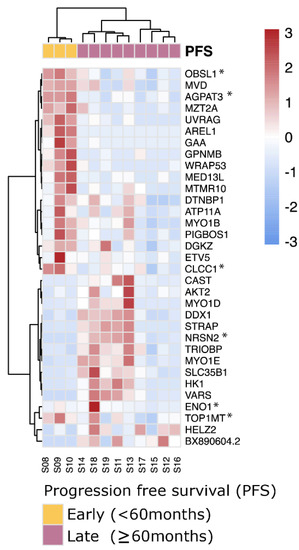 3.8. SF3B1mut UM Can Be Stratified Using Differentially Expressed Aberrant Transcripts in PFS < 60 and PFS ≥ 60 Months