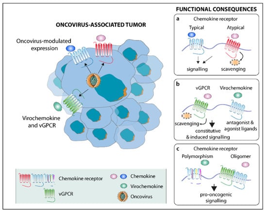Despite structural and genomic differences, oncoviruses convey the hallmarks of cancer on the host cell through convergent mechanisms, as exemplified by host interactome and transcriptome network modifications caused by oncoviruses proteins [9,10]. The chemokine (chemotactic cytokine) system is among the pathways that are targeted by all oncoviruses (Table 1). Here, we intend first to review the current knowledge of the importance of chemokines and their receptors in oncovirus-driven tumorigenesis and introduce the mechanisms underlying their action. After introducing the chemokine system, we will focus on the role of host chemokines in the inflammation associated with oncovirus-induced solid tumors, then present the pathogenic role of herpes-encoded chemokines and chemokine receptors, and finally describe how the dysregulation of the chemokine system can play an oncomodulatory role and support the pathogenic program of oncoviruses. Lastly, we provide an overview of current and future therapeutic strategies targeting the chemokine system.