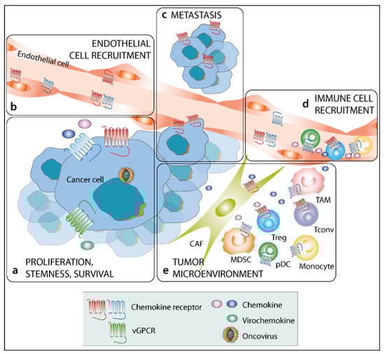 Harnessing the chemokine system to modulate oncovirus cancer features. (Viro)chemokines and their receptors can be targeted to limit (a) cancer cell stemness, proliferation, and survival, (b) angiogenesis, (c) metastasis, (d) immune cell recruitment, and (e) TME composition and polarization.