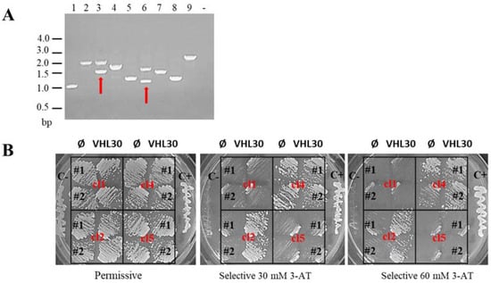 Analysis of Y2H library positive clones. (A) PCR fragment visualization on agarose gel. Each lane is marked with a number (n) corresponding to a library positive clone. The last column corresponds to the PCR negative control (-). Red arrows indicate clones with more than one insert, i.e., 3 and 6. (B) Yeast patches. All positive clones were co-transformed with pGBKT7 empty (Ø) or pGBKT7 VHL30 (VHL30) as indicated on the top row. Two independent colonies (#1, #2) of each transformation were tested on permissive (right) and selective (left) media. C+ and C- correspond to Y2H positive and negative control, respectively.