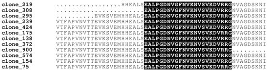 EEF1A1 multiple sequence alignment. Amino acid sequences corresponding to EEF1A1 (UniProt_ID P68104) derived from different clones. The region shared among all clones highlights the putative pVHL30 binding motifs.