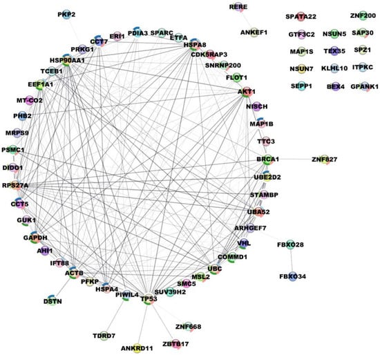 To further investigate the pathways in which these novel interactors are involved, a protein interacting network centered around pVHL30 was created using STRING [32]. The resulting network shows no trivial interaction among the 61 proteins except for a few entries which form two small clusters (Supplementary Figure S2). This preliminary network appeared to not have significantly more interactions than statistically expected, thus indicating that our dataset might be either a random collection of proteins not biologically connected, or these pVHL30 interactors have not been extensively investigated and described in STRING. To address this open question, the preliminary interacting network was enriched by including a second layer of interactors and setting “no more than 50 proteins” for each interactor (Figure 3).