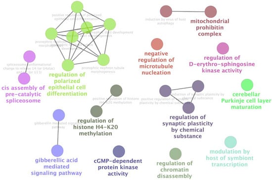 - Bindea, G.; Mlecnik, B.; Hackl, H.; Charoentong, P.; Tosolini, M.; Kirilovsky, A.; Fridman, W.-H.; Pagès, F.; Trajanoski, Z.; Galon, J. ClueGO: A Cytoscape Plug-in to Decipher Functionally Grouped Gene Ontology and Pathway Annotation Networks. Bioinformatics 2009, 25, 1091–1093. [Google Scholar] [CrossRef] [Green Version]