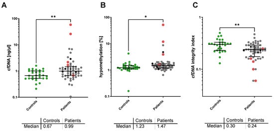 cfDNA is released from cells mostly through apoptosis, active cellular release, autophagy, and necrosis. cfDNA can be detected at a low concentration in many body fluids, including plasma, where it has been shown to have a short half-life of less than 2.5 h. In healthy individuals, the majority of circulating plasma cfDNA is derived from hematopoietic cells, especially after intense exercise [6]. Elevated cfDNA plasma concentrations correlating with tumor burden and poor prognosis have been reported for many metastatic cancers [9,10,11]. Although the exact mechanism remains to be clarified, the high degree of necrosis in many advanced tumors and the release of tumor DNA fragments via phagocytosis of necrotic neoplastic cells might contribute to the increased release of cell-free tumor DNA into the circulation. Therefore, an increased cfDNA plasma concentration has been reported to be a promising tumor marker for non-invasive cancer diagnosis, evaluation of prognosis, and therapy monitoring. In addition, the fragmentation and methylation pattern of cfDNA derived from tumor cells seem to be different from cfDNA derived from healthy cells. DNA methylation occurs mainly on CpG motifs, where a guanine base immediately follows a cytosine base in the 3′ direction. There are over 28 million CpG dinucleotides in humans, of which up to 80% are methylated. CpG islands are restricted to only two locations in DNA: in a methylated form in the long repetitive sequences of non-coded DNA sections and also in the promoter area of a gene [12,13,14]. Most of the human genome is methylated, but in a wide range of pathologies, including cancer, a global DNA hypomethylation occurs. This hypomethylation affects, to a large extent, repetitive elements, which constitute ~45% of the genome. It was demonstrated that the methylation of different repetitive sequences, namely, LINE-1, Alu, and satellite 2 (Sat2), significantly correlated with global methylation levels [15]. Therefore, these repeats can be used as surrogate reporters of global methylation [16], and increased rates of global hypomethylation have been reported in the tissue [17,18,19,20,21] and blood [22,23,24,25] of many cancer patients, whereas little is known about global hypomethylation of cfDNA in cancer patients [26,27,28].
