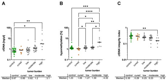 Plasma cfDNA concentration (A), cfDNA hypomethylation (B), and cfDNA integrity (C) with respect to tumor burden (no tumor, low, moderate, or high tumor burden) * p < 0.05.; ** p < 0.01; *** p < 0.001; **** p < 0.0001.