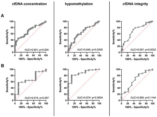 Receiver operating characteristic (ROC) curves to distinguish between healthy controls and patients with advanced NEN disease (A) and between presumably cured NEN patients and patients with advanced NEN (B) for cfDNA concentration (left), percentage of cfDNA hypomethylation (middle), and cfDNA integrity (right).