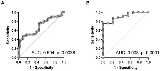 The ROC curve analysis for plasma cfDNA concentration was able to distinguish between metastatic NEN patients and healthy individuals with an estimated AUC of 0.691 (95% CI, 0.58 to 0.80; p = 0.0044) with a sensitivity of 81.1% and a specificity of 41.4% at the chosen cutoff point of > 0.6 pg/µL. For Alu hypomethylation, the AUC was 0.645 (95% CI, 0.52–0.77; p = 0.0309) with a sensitivity of 58.5% and a specificity of 69% at the chosen cut off point of > 1375%, and for cfDNA integrity, the AUC was 0.697 (95% CI, 0.58−0.82; p = 0.0033, Figure 3A) with a sensitivity of 73.6% and a specificity of 62.1% at the chosen cutoff point of < 0.28. When ROC analysis was performed to differentiate cured NEN patients from the group of patients with advanced NEN disease a similar, not significant AUC was found for cfDNA concentration (AUC 0.674; 95% CI, 0.50 to 0.85; p = 0.097) and cfDNA integrity (AUC 0.666; CI, 0.47–0.86; p = 0.1144). However, hypomethylation revealed a very high and significant AUC of 0.874 (95% CI, 0.77–0.98; p = 0.004) for the presence of an advanced tumor as compared to the cured patients with the highest accuracy obtained at a cutoff > 1.135%, which corresponded to a sensitivity and specificity for the presence of an advanced NEN of 79.6% and 88.9%, respectively (Figure 3B).