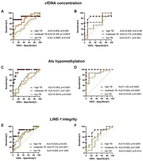 ROC analysis of plasma cfDNA concentration (A,B), Alu hypomethylation (C,D), and LINE-1 integrity (E,F) for distinguishing healthy controls (A,C,E), or cured patients (B,D,F) from patients with low, moderate, and high tumor burden (TB), along with the area under the curve (AUC), for sensitivities and specificities see Table S2 in the Supplement.
