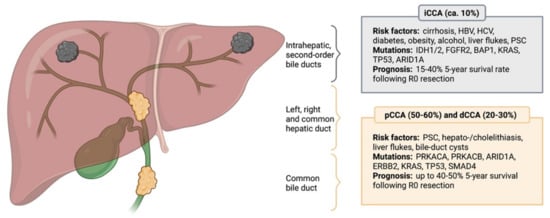 Cholangiocarcinoma (CCA) is a highly aggressive malignancy and the second most common primary liver tumor, accounting for three percent of all gastrointestinal malignancies [1]. The classification is based upon the anatomical site of origin, thus differentiating between intrahepatic (iCCA), perihilar (pCCA) (also called Klatskin tumor), and distal (dCCA) cholangiocarcinoma, with dCCA and pCCA being summarized as extrahepatic cholangiocarcinomas (eCCA). The most common entities are dCCA and pCCA, accounting for about 30% and 50% of all CCAs, respectively. In contrast, iCC represents only about 10% of all CCAs [2]. The anatomical boundary defining eCCA is the cystic duct, with dCCA arising distal and pCCA proximal of the junction of the cystic duct, comprising the right and left hepatic ducts up to the second order biliary branches. Tumors located above the second order bile ducts are termed iCCA [1,3,4]. Different types of CCA do not only differ in their etiology, pathophysiology, and treatment, but also possess unique biological and pathological features, providing the opportunity for individualized prognosis determination and targeted therapies.