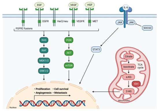 Figure 2. Signaling pathways in cholangiocarcinoma. Multiple signaling pathways are involved in the development and progression of CCA. Receptor tyrosine kinases activate the RAS-MAPK pathway and the PI3K-AKT pathway. IL-6 induces the JAK/STAT signaling pathway. Consequently, these pathways impact important cellular processes, such as cell proliferation, differentiation, survival, and angiogenesis. IDH 1/2 mutations lead to the accumulation of the oncometabolite intracellular 2-hydroxyglutarate (2-HG). Adapted from [30]. FGFR2: Fibroblast growth factor receptor 2; EGF: Epidermal growth factor; EGFR: Epidermal growth factor receptor; Her2/neu: Human epidermal growth factor receptor 2; VEGF: Vascular endothelial growth factor; VEGFR: Vascular endothelial growth factor receptor; HGF: Hepatocyte growth factor; MET: C-met-encoded receptor for hepatocyte growth factor; IL-6: Interleukin-6; JAK: Janus kinase; SOCS3: Suppressor of cytokine signaling 3; STAT3: Signal transducer and activator of transcription protein; RAS: Rat sarcoma; RAF: Rat fibrosarcoma; MEK1/2: Mitogen-activated protein kinase kinase; ERK1/2: Extracellular signal-regulated kinase 1/2; PI3K: Phosphatidylinositol 3 kinase; AKT: Protein kinase B; mTOR: Mammalian target of rapamycin; α-KG: α-Ketoglutaric acid; 2-HG: 2- hydroxyglutarate; IDH: Isocitrate dehydrogenase; TCA cycle: Citric acid cycle.