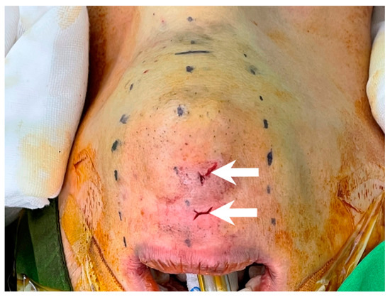 After incising the oral mucosa, the central incision was further dissected down to the lower edge of the mandible with an electrocautery or Kelly clamp. The mentalis muscle might be cut or penetrated during this process [18,35,36,37,38]. This injury might lead to uncoordinated movement of the lower face during pronunciation or smiling [39,40]. In addition, skin perforation might occur due to heat transmission from electrocautery [41] or direct penetration by applying excessive force using a Kelly clamp (Figure 3). Initial occult injury in such a thin flap might also lead to skin dimpling that does not resolve over time and affects the patient’s aesthetic outcome [42]. Great care should be taken to check the thickness of the chin flap at this stage.
