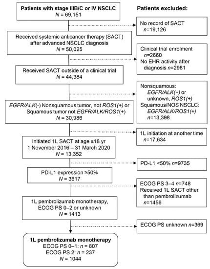 This retrospective observational study utilized deidentified EHR data from the US nationwide Flatiron Health advanced NSCLC database, which includes patients with pathologically confirmed advanced NSCLC (newly diagnosed or recurrent/progressive disease) who had at least two visits recorded in the database on or after 1 January 2011 []. We studied patients who were at least 18 years old at the time of initiating first-line pembrolizumab from 1 November 2016 through 31 March 2020 for treating unresectable NSCLC (stage IIIB/C or stage IV) with PD-L1 expression ≥ 50%. Other inclusion criteria were no known EGFR, ALK, or ROS1 genomic alterations and, for nonsquamous tumors, documented wild-type EGFR and no ALK gene rearrangements.