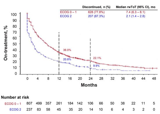 The Kaplan–Meier method was used to estimate rwToT with pembrolizumab, as previously described [,]. In brief, rwToT was determined as [(date of last recorded pembrolizumab dose − date of first recorded dose) + 1 day], defining treatment discontinuation at the last noncancelled order or administration date if patients died during pembrolizumab therapy or initiated a next line of therapy, or if there was a gap of ≥120 days between the last recorded pembrolizumab dose and last clinical contact date in the dataset []. We determined the median rwToT and the restricted mean rwToT, as well as the percentage of patients still receiving pembrolizumab at 12, 24, 36, and 48 months [], stratified by ECOG PS. The restricted mean was defined as the mean calculated with the assumption of a maximum pembrolizumab exposure at designated time points (i.e., 12, 24, 36, and 48 months in this study) for those patients still on treatment at data cutoff. For timepoints at which the data were considered not sufficiently mature, the restricted mean rwToT was extrapolated using parametric functions fitted to the Kaplan–Meier data [,,].