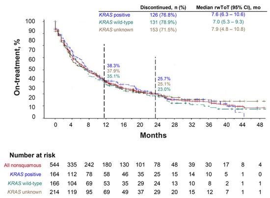 In the present study, half of those tested with nonsquamous tumors had KRAS-mutated NSCLC, which was not unexpected because KRAS mutations are more prevalent in PD-L1-expressing tumors. Similarly, in another study restricted to high PD-L1-expressing tumors (PD-L1 ≥ 50%) and no EGFR/ALK/ROS1 genomic alteration, Noordhof et al. [] found that 57% of metastatic lung adenocarcinomas carried KRAS mutations. Instead, in the broader sample not restricted by PD-L1 expression included in the Lung Cancer Mutation Consortium study, 27% of 1655 patients had metastatic lung adenocarcinomas harboring a KRAS mutation []. We found that the median and restricted mean rwToT with pembrolizumab monotherapy were similar for KRAS-mutated vs. wild-type vs. all nonsquamous tumors, with Kaplan–Meier estimated on-treatment rates at 24 months of 26%, 23%, and 25%, respectively. These findings are aligned with those of others who reported no differences in the effectiveness of first-line ICI therapy according to KRAS mutation status [,], although a concomitant STK11 mutation was found to be associated with PD-1 inhibitor resistance and worse clinical outcomes []. We did not have information regarding KRAS mutation subtypes; however, in one large chart review study, responses and duration of benefit with available therapies were similar with KRAS G12C mutations versus KRAS non-G12C mutations []. Moreover, in KN042, patients who had KRAS-mutated tumors, including those with the KRAS G12C mutation, experienced improved outcomes with pembrolizumab compared with chemotherapy []. We note that the first inhibitor of the KRAS G12C mutation, sotorasib, was approved in the US in May 2021 for previously treated advanced NSCLC.