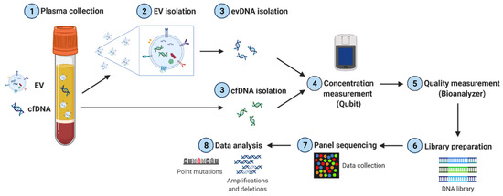 - Ruhen, O.; Mirzai, B.; Clark, M.E.; Nguyen, B.; Salomon, C.; Erber, W.; Meehan, K. Comparison of Circulating Tumour DNA and Extracellular Vesicle DNA by Low-Pass Whole-Genome Sequencing Reveals Molecular Drivers of Disease in a Breast Cancer Patient. Biomedicines 2020, 9, 14. [Google Scholar] [CrossRef] [PubMed]
