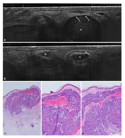 Nodular BCC on the lower leg of a 68-year-old female patient. (a,b) LC-OCT images. The nodular BCC presents itself with a fine granular texture corresponding to basaloid cells, peritumoral clefting (white arrows) and homogeneous areas with possibly liquefactive necrosis with remaining cell debris (white asterisks). (c) (40×), (d) (100×), and (e) (100×): corresponding histological HE-stained sections with peripheral palisading, clefting, and a central necrosis.