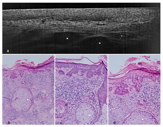 Sebaceous hyperplasia on the nose of a 70-year-old male patient. (a) LC-OCT image. The enlarged sebaceous glands are visible as hyporeflective ovoid structures (white asterisk). When looking carefully, roundish sebocytes might be spotted within the glands. (b) (100×) and (c) (200×) and (d) (200×): histological HE-stained sections. Enlarged, regularly structured sebaceous glands (white asterisk).