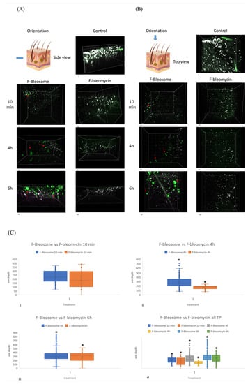 Imaris 9.1.2 (Bitplane) software (Oxford Instruments, Abingdon, UK) was used to analyze 3D images acquired by MP. Structures labelled with Hoechst 33342 staining that did not emit or emitted a low green fluorescent signal (including a majority of auto-fluorescent skin appendages such as connective tissue) were considered as “surfaces” (“surfaces” had NDD R3-blue source channel), while all the elements emitting high levels of the green signal, either labelled with Hoechst 33342 (such as cellular nuclei) or not (F-Bleosome and F-bleomycin), were labelled as “spots” (“spots” had NDD R4-green source channel). After this distinction, the program distinguished between the “spots far from surfaces” (green particles emitting high- intensity green fluorescence far from the particles emitting blue and low-intensity green fluorescence), from the “spots close to surfaces” (green particles emitting high-intensity green fluorescence, and blue fluorescence very close to auto-fluorescent skin and cellular structures, emitting low-intensity green fluorescence), using a specific threshold (0.5). The aim was to target the green particles that were far from the auto-fluorescent skin structures and that were not stained with Hoechst 33342 (cellular nuclei were always close to intracellular auto-fluorescent elements and thus recognised as “spots close to surfaces”). This system enabled us to identify F-bleomycin and F-Bleosome particles within the examined skin section, recognised as green emitting particles far enough from auto-fluorescent structures (“spots far from surfaces”). All images were visualised from the subcutaneous side of the skin section. Imaris automatically compensated for the inversion and depths were compared to fluorescent images. In the equine skin samples, there was a discrepancy between the computer compensated values and the images, and here we manually compensated for this inversion by making all particles relative to the deepest particle in each image.