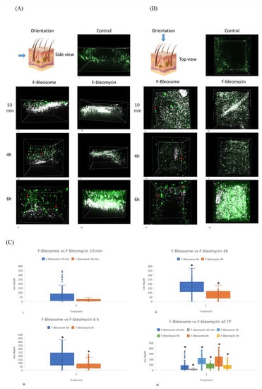 4]. We effectively mono-labeled bleomycin with BODIPY-FL prior to encapsulation in UD liposomes (F-Bleosome) and confirmed the comparable cytotoxic effect on cell lines compared to unlabeled Bleosome. Using F-Bleosome we were able to visualize the drug within the UD liposomes as it penetrated through the skin. We found that F-Bleosome penetrated beyond the keratinocyte layer and penetrated deeper over time compared to F-bleomycin, which was mainly retained in the superficial layers of the skin. The epidermal thickness of the skin is estimated to be approximately 40 μm and 30 μm for canine [
