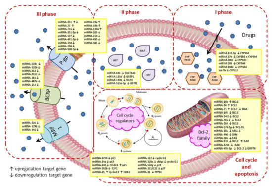 MiRNAs involved in the regulation of MDR mechanisms. The natural effect of miRNAs is to suppress translation from the respective mRNA, which is either blocked or subject to degradation. However, upregulation of proteins may also occur, e.g., proto-oncogenes, if the miRNA is targeted to tumor suppressor genes. In MDR, miRNAs target phases I, II, and III of detoxification and are also active in systems regulating the onset and progression of apoptosis or cell cycling.