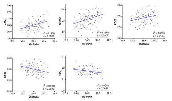 In the ccRCC proteomic dataset, we identified 38 RTKs at a range of variable frequency (6.8–100% of 103 cancers) (Table S2), while myoferlin was expressed in all samples. Among the RTKs, c-Met (p = 0.0002), EPHA7 (p = 0.0007), and EGFR (p = 0.0149) were positively correlated with myoferlin expression, whereas HER2 (p = 0.0029) and TEK (p = 0.0498) were negatively correlated (Figure 1). We further investigated Ki-67, p53, CXCR4, CA9, and VHL, which are important non-RTK proteins in ccRCC and other cancers. There was no association between myoferlin and these proteins (Figure S1).