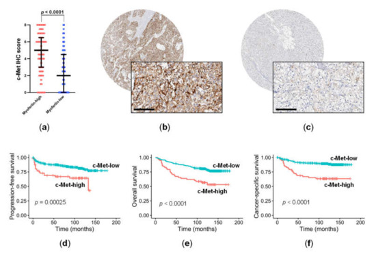 IHC staining for c-Met was prominent in the cell membrane. Consistent with the proteomics results, c-Met was significantly upregulated in ccRCC samples that had high myoferlin expression compared to those with low myoferlin expression (Mann–Whitney test, p < 0.0001) (Figure 2a). For survival analysis, the expression of c-Met was classified as high in 58 (14.1%) (Figure 2b), and low in 352 samples (85.9%) (Figure 2c). Kaplan–Meier curves with log-rank tests showed that high c-Met expression was associated with adverse PFS (p = 0.00025; Figure 2d), OS (p < 0.0001; Figure 2e), and CSS (p < 0.0001; Figure 2f). In line with the different survival rates, high c-Met expression correlated with the poor IMDC risk group (p = 0.0058), high TNM stage (III/IV vs. I/II, p = 0.0078), and high WHO grade (3/4 vs. 1/2, p < 0.0001) in clinicopathological data (Table 1). High c-Met expression was also associated with high myoferlin expression (p < 0.0001) (Table 1), and a previous study showed that this was related to an unfavorable prognosis in ccRCC [11].