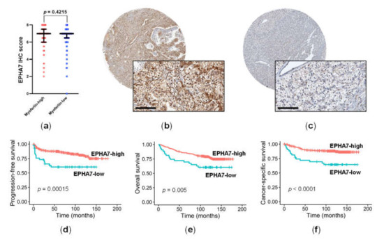 Next, the expression levels of IHC staining for EPHA7 were determined in the primary cohort. EPHA7 staining was available in 408 ccRCCs, and this was positive in the cell membrane and cytoplasm. Although we failed to find an association between EPHA7 and myoferlin expression (Mann–Whitney test, p = 0.4215; Figure 3a), we found a correlation between EPHA7 expression, which was high in 375 (91.9%) patients and low in 33 (8.1%) (Figure 3b,c), and patient prognosis. Low EPHA7 expression was significantly associated with shorter PFS (p = 0.00015; Figure 3d), OS (p = 0.005; Figure 3e), and CSS (p < 0.0001; Figure 3f) in patients with ccRCC. In addition, low EPHA7 expression had a negative impact on PFS (HR = 2.551, 95% CI = 1.358–4.644, p = 0.0033) and CSS (HR = 2.979, 95% CI = 1.548–5.733, p = 0.0011). When adjusted for TNM stage (III/IV vs. I/II) and WHO grade (3/4 vs. 1/2), low EPHA7 expression was selected as an independent, unfavorable prognostic factor for PFS (adjusted HR = 2.311, 95% CI = 1.237–4.319; p = 0.0086) and CSS (adjusted HR = 2.352, 95% CI = 1.214–4.558; p = 0.0113) (Table 4).