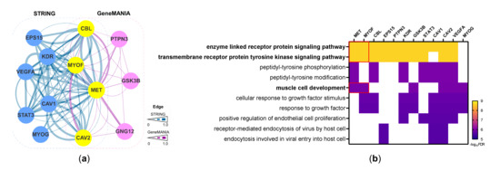 The aforementioned data, which showed a correlation between c-Met and myoferlin expression, were consistent with the functional relationship between myoferlin and various RTKs [5,7,8,9,10]. This suggests that c-Met and myoferlin may be involved together in the progression of ccRCC. To test this hypothesis, we built a network of proteins that interact with both c-Met and myoferlin using STRING and GeneMANIA tools [21,22]. Figure 4a presents the 13 prioritized proteins, consisting of 10 from STRING (blue nodes) and 7 from GeneMANIA (pink nodes) with 4 in common (yellow nodes). These interacting proteins may represent a co-functional module of c-Met and myoferlin. GOBP enrichment analysis of the 13 interacting proteins showed that c-Met and myoferlin were co-enriched for processes related to RTK signaling, which also included CBL, EPS15, PTPN3, KDR, GSK3B, STAT3, CAV1/2, and VEGFA, and muscle development, which also included GSK3B, CAV2, VEGFA, and MYOG (Figure 4b).