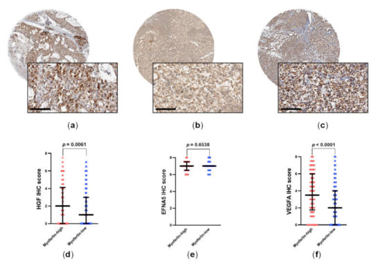 We next examined the expression of RTK ligands, including HGF (Figure 5a), EFNA5 (Figure 5b), and VEGFA (Figure 5c), in the membranes of tumor cells. HGF and EFNA5 are ligands of c-Met and EPHA7, respectively; while VEGFA is a ligand of VEGFR. Notably, VEGFA was also included in the co-functional network for c-Met and myoferlin. HGF and VEGFA levels were significantly upregulated (p = 0.0061 and p < 0.0001, respectively; Figure 5d,f) and the change in ENFA5 level was not significant (p = 0.6538; Figure 5e) in samples with high myoferlin expression, when compared to those with low myoferlin expression.