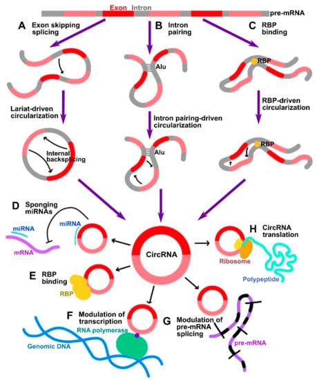 - Cheng, D.; Wang, J.; Dong, Z.; Li, X. Cancer-related circular RNA: Diverse biological functions. Cancer Cell Int. 2021, 21, 11. [Google Scholar] [CrossRef]