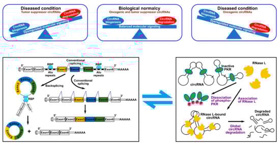CircRNA homeostasis determines normal biological conditions or disease state. (Top panel) such homeostasis is determined by the fine balance between circRNA biogenesis and degradation mechanisms. (Bottom panel) schematic representation of a typical RBP-driven biogenesis mechanism (left) and of the RNase L-dependent degradation mechanism (right).