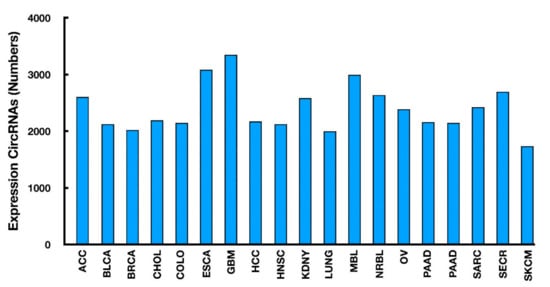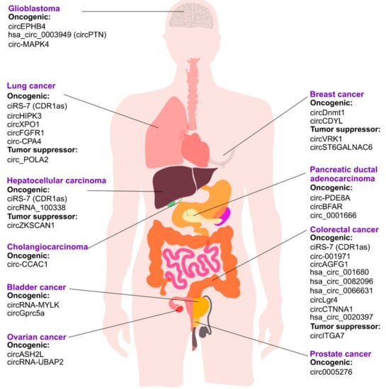 Nowadays, a genome-wide approach is widely employed to identify cancer-specific circRNAs. In a recent study in the human tissues, 895 circRNAs have been identified as tissue-specific, in contrast to 2329 less tissue-specific and 1469 ubiquitously expressed circRNAs [31,32]. On the basis of such systematic analyses, cancer-related circRNAs can also be easily identified from the MiOncoCirc database (https://mioncocirc.github.io/) [32] (Figure 3). By comparing the expression profile between cancer and the respective noncancerous tissues, the primary functions of circRNAs can be simply classified into oncogenic and tumor suppressive modes [32].