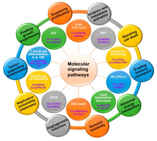 Since cancer pathogenesis is often considered in the framework of cancer hallmark-associated pathways [26,27,33], the subsequent sections will be dedicated to the summary of circRNAs implicated in each hallmark.