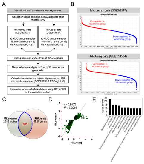 To identify novel gene signatures for detecting recurrence in HCC patients who underwent surgical resection, we analyzed gene expression profiles using two different datasets analyzed by microarray and RNA-seq. We requested clinical information of patients and datasets from corresponding authors to perform the integrative analysis. The workflow of this study is shown in Figure 1A. Microarray data (GSE89377) were acquired from 32 tissues (8 non-recurrence tissues and 24 recurrence tissues), and RNA-seq data (GSE114564) were obtained from 53 tissues (32 non-recurrence tissues and 21 recurrence tissues). Upregulated and downregulated genes in the recurrence group of each dataset were estimated using SAM, a supervised learning software for genomic expression data mining (Figure 1B). A total of 2385 and 5927 genes were differentially expressed in the two datasets, and a Venn diagram analysis of the two sets revealed that 981 genes that were differentially expressed were part of a common molecular signature for both datasets (Figure 1C). We found that the 981 differentially expressed genes (DEGs) were significantly correlated with microarray and RNA-seq data (Pearson’s correlation coefficient r = 0.9178, p < 0.001) (Figure 1D). Gene ontology (GO) analysis demonstrated that 981 DEGs were associated with HCC biological processes such as the Wnt signaling pathway, angiogenesis, and blood coagulation (Figure 1E).