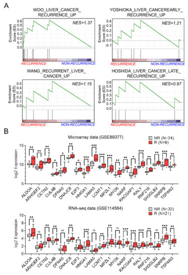 Nineteen core genes were associated with recurrence and upregulated in patients with recurrent HCC. (A) Correlation between gene set enrichment analysis (GSEA) of the 981 DEGs and HCC recurrence in four datasets. (B) Expression level of 19 genes in recurrence and non−recurrence tissues in both datasets. Statistically significant differences were determined using the Unpaired t−test (* p < 0.05, ** p < 0.01, *** p < 0.001). ns; not significant.
