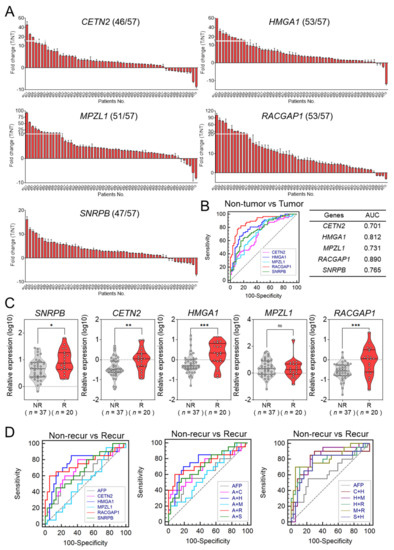 We performed GSEA with four different gene sets that were previously studied for HCC recurrence to identify the relevance of the verified genes with recurrence. For more accurate verification, we used the GSE39791 database to evaluate the expression of 19 genes to confirm that they were upregulated in HCC tissues. We identified five genes (CETN2, HMGA1, MPZL1, RACGAP1, and SNRPB) associated with HCC prognosis that are potential biomarkers for HCC recurrence. Among the five genes, CETN2, HMGA1, RACGAP1, and SNRPB were significantly upregulated in patients with recurrent HCC. Additionally, the combination of HMGA1 and MPZL1 had the best AUC for predicting HCC recurrence.