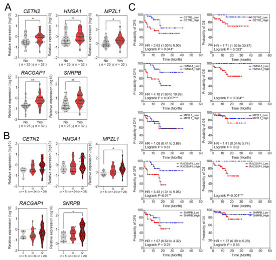 We evaluated whether the five selected genes were related to the clinicopathological characteristics of patients with HCC in the validation set: CETN2, MPZL1, RACGAP1, and SNRPB were significantly overexpressed in patients with vascular invasion, but HMGA1 was not overexpressed (Figure 5A). The five selected genes were upregulated in proportion to Edmondson–Steiner tumor differentiation grades, but only MPZL1 and SNRPB showed statistical significance (Figure 5B). Next, we examined the prognostic impact of these five genes in the validation set. In patients with HCC, the, high expression levels of CETN2, HMGA1, and RACGAP1 were significantly associated with OS and DFS (Figure 5C).