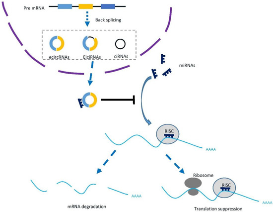 Biogenesis and function of circRNAs. CircRNAs were generated by back splicing of precursor mRNAs, and they can be classified as exonic circRNAs (ecircRNAs), exon-intron circRNAs (EIciRNAs), and circular intronic RNAs (ciRNAs) based on the introns or exons it contains. Typically, circRNAs sponge micro RNAs and rescue their repression of downstream mRNAs. RISC: RNA-induced silencing complex.